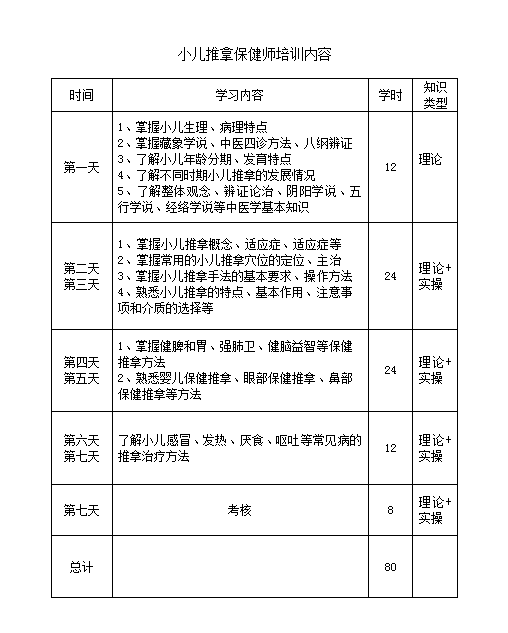 初級小兒推拿保健師培訓(xùn)時間為7天,共80學(xué)時,保證學(xué)員學(xué)會小兒推拿保健基本理論和基本技能,培訓(xùn)合格頒發(fā)烏蘭察布醫(yī)學(xué)高等專科學(xué)校培訓(xùn)合格證書。