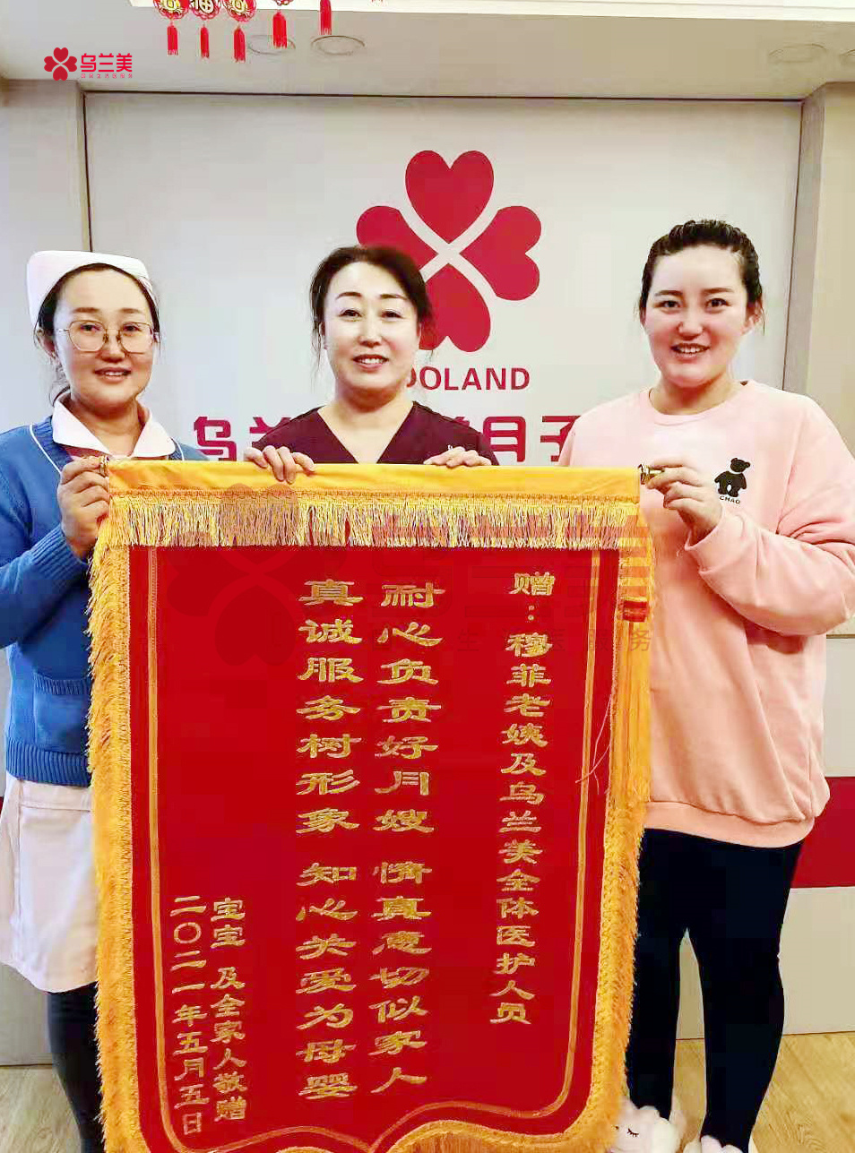 5月5日一大早,烏蘭美醫(yī)養(yǎng)月子中心的每一位母嬰護理師和工作人員的臉上,都洋溢著幸福的笑容??蛻粼S娜一家將一面印有“耐心負責(zé)好月嫂,情真意切似家人,真誠服務(wù)樹形象,知心關(guān)愛為母嬰”的錦旗,親自送到了烏蘭美醫(yī)養(yǎng)月子中心母嬰護理師穆菲(簡稱,穆姐)手里,以此感謝她對寶媽和寶寶無微不至的關(guān)懷與照護,并對烏蘭美健康集團的正規(guī)和專業(yè)表示了認可!