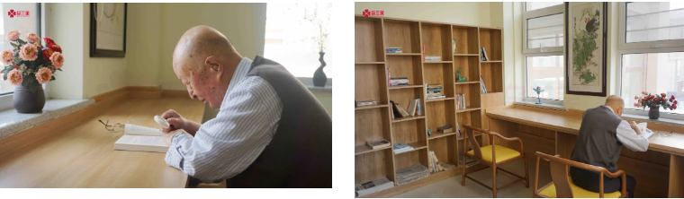 在烏蘭美康養(yǎng)院的圖書室里,人們常常會(huì)看到一位老人拿著放大鏡在埋頭讀書,一讀就是2小時(shí)。談及爺爺?shù)拈喿x愛好,老人家興奮地說(shuō):“我每天早上起來(lái),在康養(yǎng)院內(nèi)散散步。九點(diǎn)左右就去康復(fù)訓(xùn)練室里用按摩椅活動(dòng)活動(dòng)筋骨,九點(diǎn)半左右我就去圖書室了,一般看兩小時(shí)的書。每天中午和晚上睡覺(jué)前,我是一定要看一小時(shí)書的,這已經(jīng)成為了生活‘必需品’。”不少人感嘆王爺爺?shù)淖月?,他卻打趣道:“我也是勞逸結(jié)合!午睡后,我會(huì)到活動(dòng)室打兩小時(shí)的麻將。”