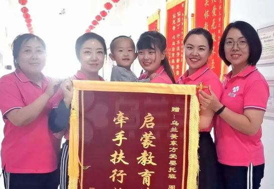近期,烏蘭美早教中心托班王浩然小朋友的媽媽,為表達烏蘭美早教中心老師們對孩子的辛勤教育和悉心照料的感激之情,將印有“啟蒙教育第一師,牽手扶行始登峰”的錦旗送到老師手中,感謝托班的周靜老師及全體老師們,更加感謝烏蘭早教中心擁有如此出色的師資隊伍。